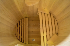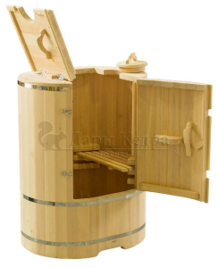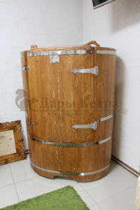 Овальная фитобочка из кедра - это мини парная, которую можно использовать не только в спа-салонах, но и дома. Овальная модель более просторна и удобна в использовании. Толщина стенок составляет 40-45 мм, что позволяет увеличить срок службы изделия. Она оборудована откидными створками, дверцей и отверстием для головы. Во время парения человек сидит внутри кедровой бочки, а голова находится снаружи. Благодаря этому исключается возможность перегрева. Подлокотники из кедра, встроенные ручки на створках и двери делают эксплуатацию более удобной.