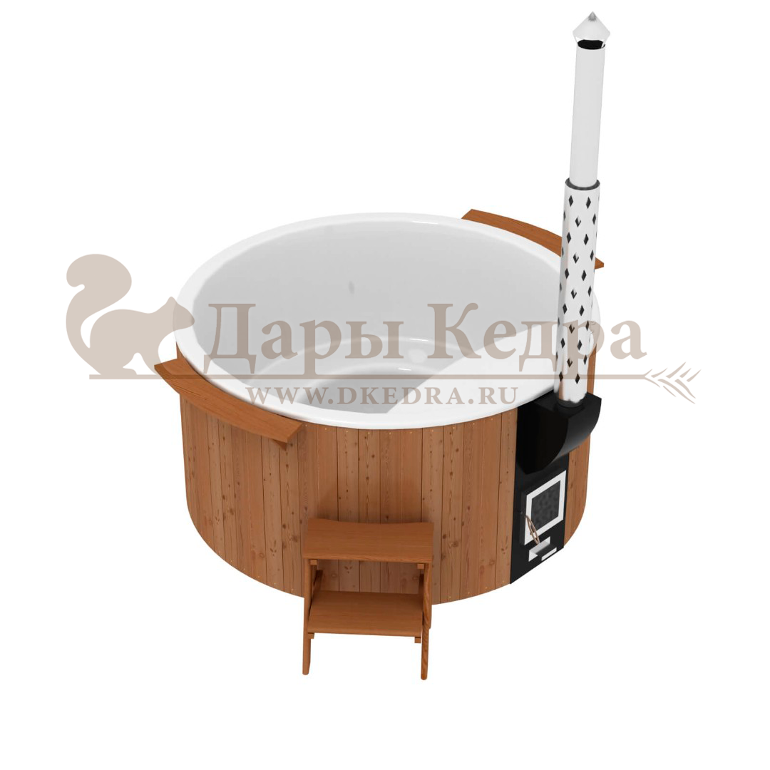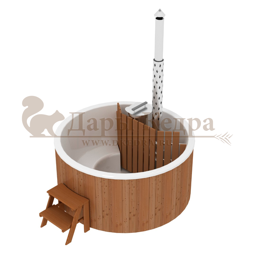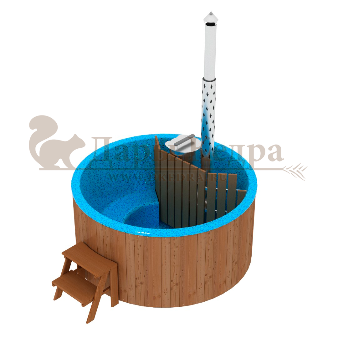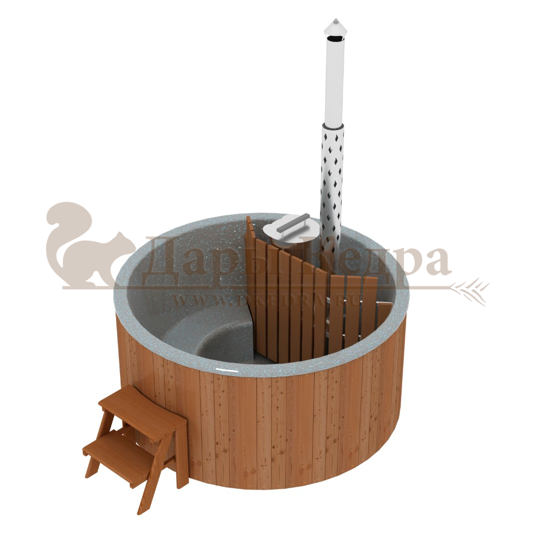 Фурако круглая из кедра с термопластиковой вставкой со встроенной печью Это уличная подогреваемая купель с круглой внутренней чашей из термопластика. Для удобства пользования купель оборудована лавочками, приставной и внутренней лестницей. Нагрев воды происходит за счет встроенной печи, которая находится внутри купели за перегородкой. В комплектацию этой модели входит савок с длинной ручкой, который позволяет извлекать угли после эксплуатации изделия. Термопластик устойчив к воздействию температур, облегчает уход за купелью и увеличивает срок ее службы. Парение на свежем воздухе – это отличный способ укрепить здоровье и поддержать организм в тонусе.