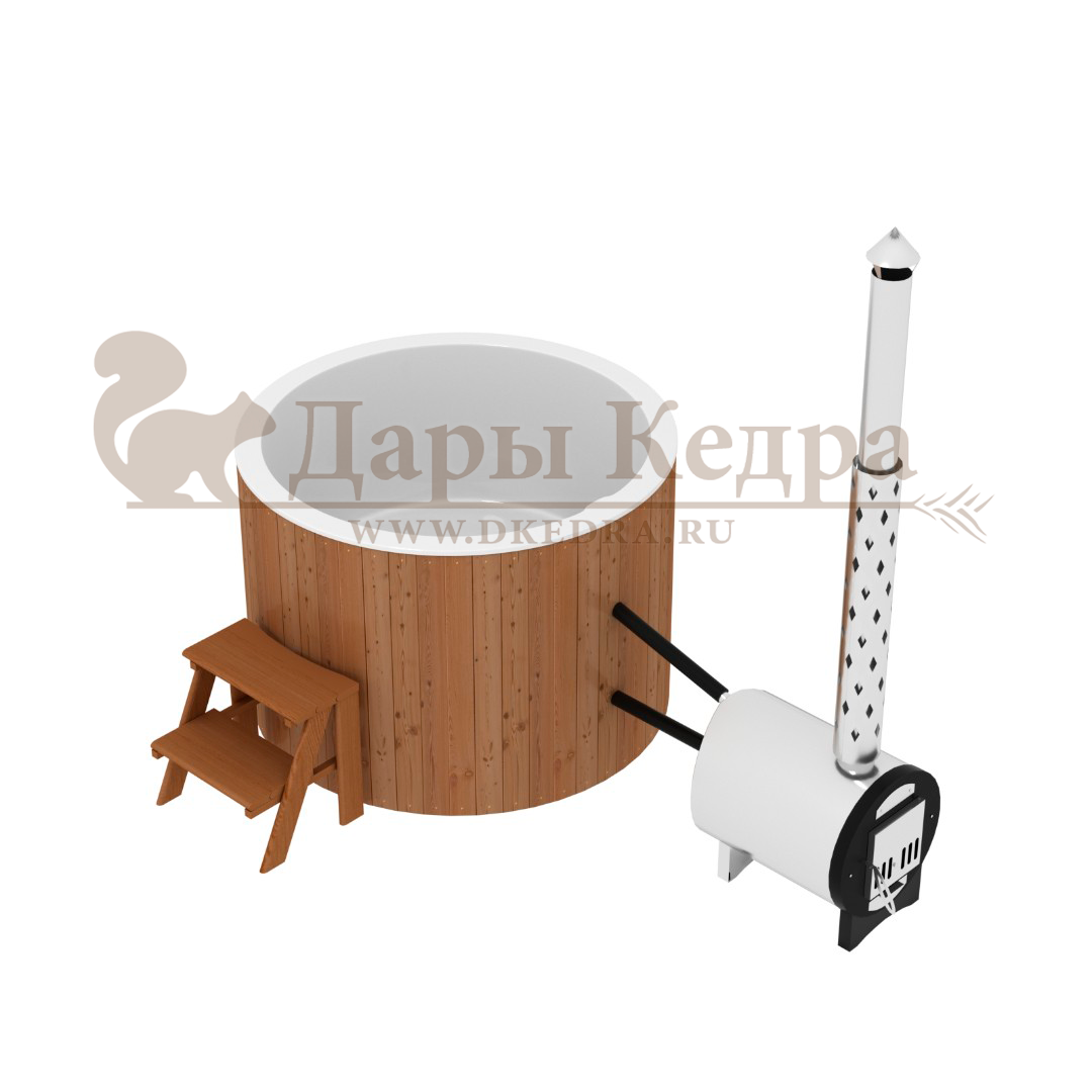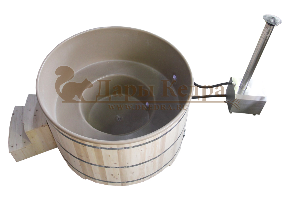Фурако круглая из кедра с литой термопластиковой вставкой с внешней печью Это уличная подогреваемая купель с круглой внутренней чашей из термопластика, которая имеет цельную форму вместе с сиденьями и дном. Для удобства пользования купель фурако оборудована приставной лестницей. Подогрев воды осуществляется за счет внешней печи с дымоходом. Термопластик устойчив к воздействию температур, облегчает уход за фурако и увеличивает срок ее службы. Парение на свежем воздухе – это отличный способ укрепить здоровье и поддержать организм в тонусе.