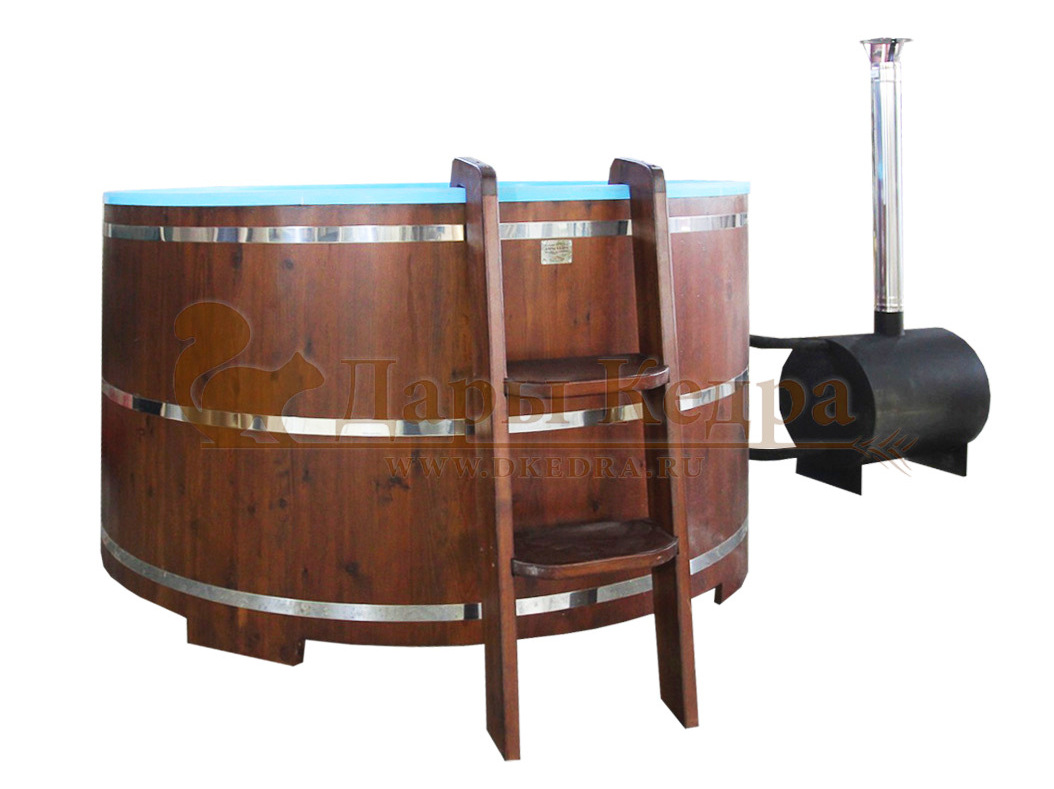 Фурако овальная из кедра с внешней печью Это уличная баня, которой можно пользоваться круглый год. Купель представляет собой овальную емкость для воды, внутри которой располагаются сиденья из кедра. Подогрев воды осуществляется за счёт внешней печи с дымоходом, которая подключается с помощью шлангов с выходом внутри термостойких форсунок. Для удобства пользования японская баня фурако оборудована внешней и внутренней лестницей из кедра. Целебная древесина кедра богата фитонцидами и эфирными маслами, которые активируются при нагревании. Таким образом, во время процедур парения организм насыщается полезными веществами.